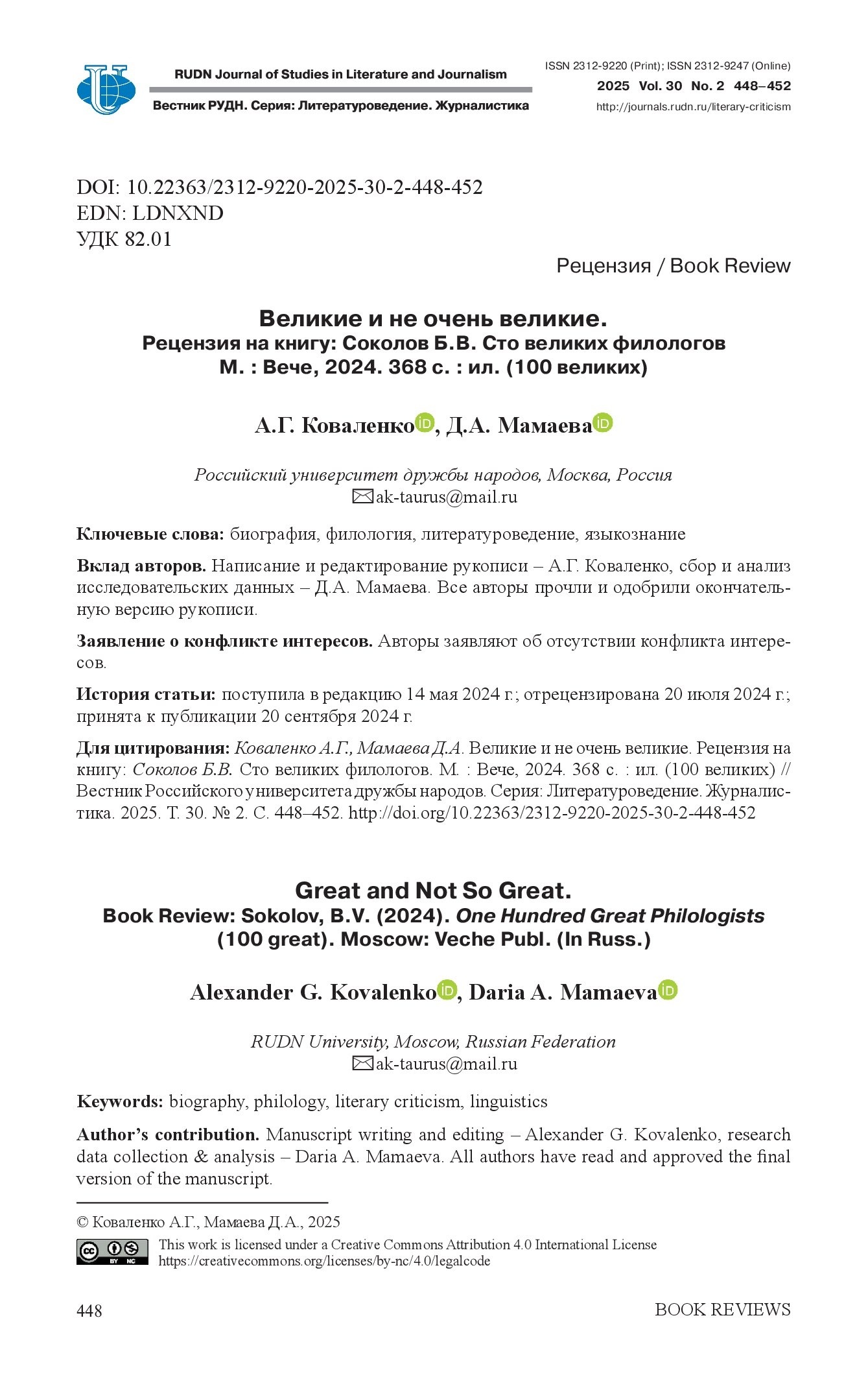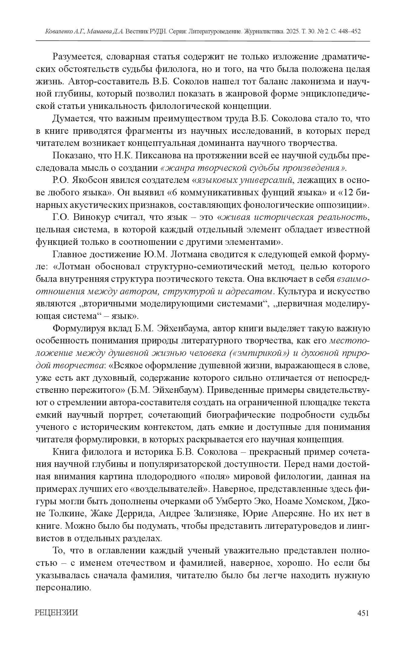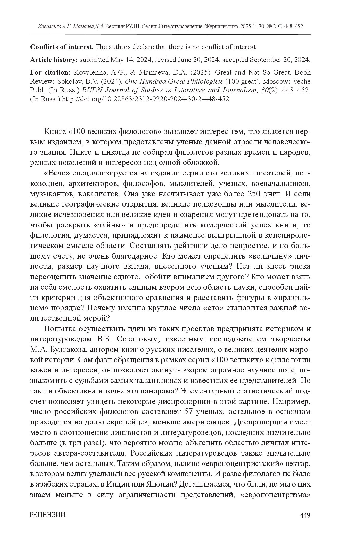 "Великие и не очень великие": "Вестник РУДН" о научно-популярной книге писателя и литературоведа Бориса Соколова "100 великих филологов"Рецензия на книгу Бориса Вадимовича Соколова "100 великих филологов", 2024 год.
